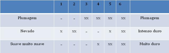 Para o objetivo deste exercício são admitidas 6 categorias de plumagem ordenadas gradualmente a partir da plumagem mais suave até à plumagem mais dura.